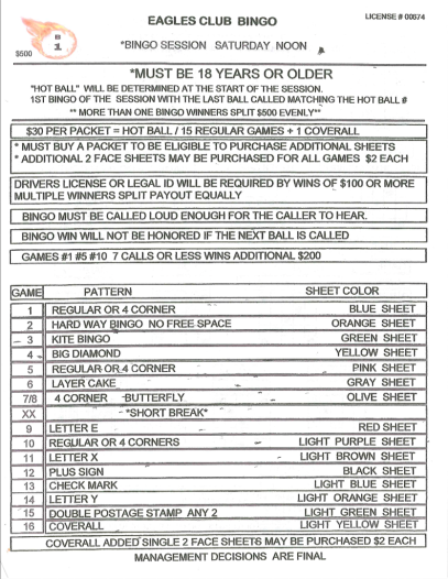 Please note: For 90% Bingo days - No saving seats!!!! .